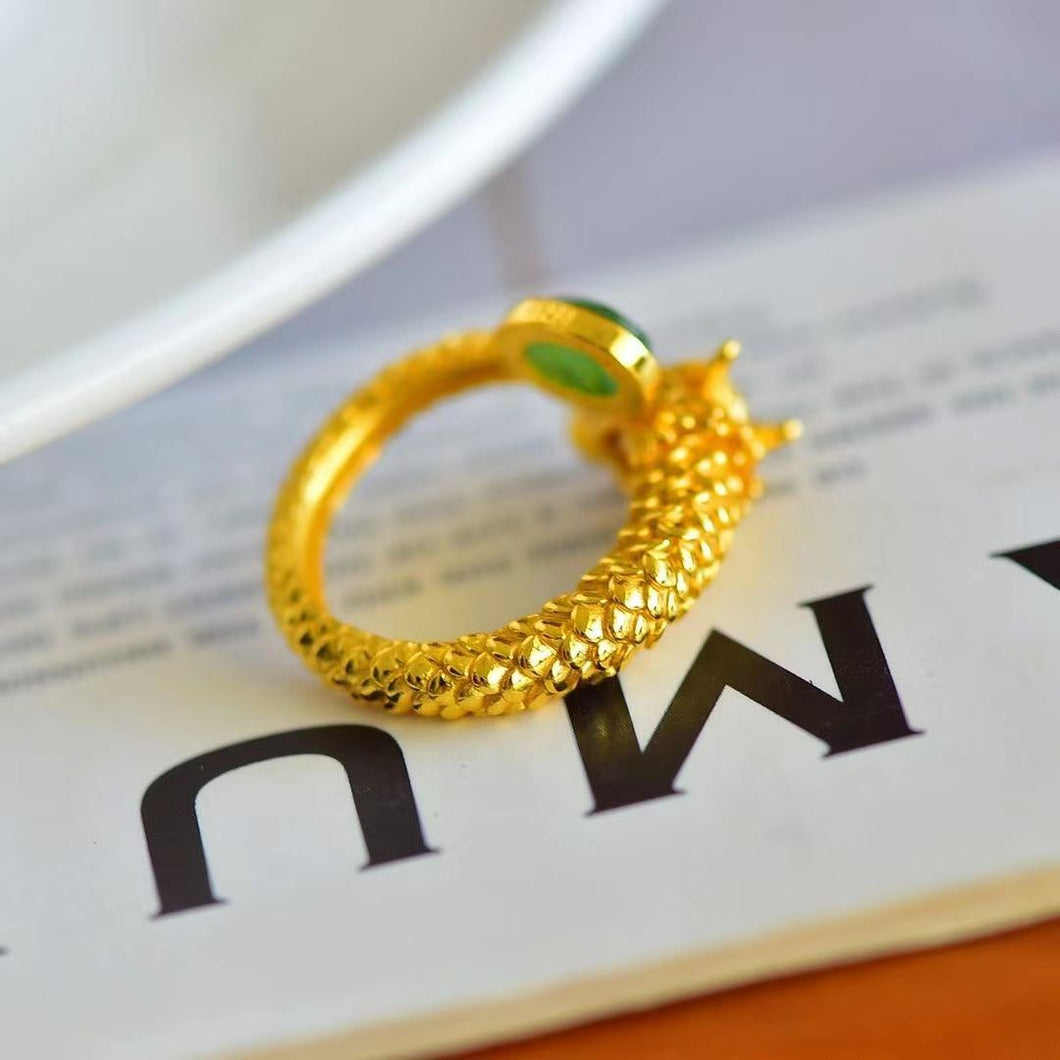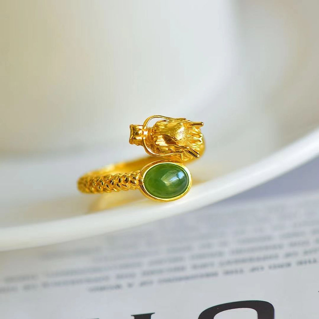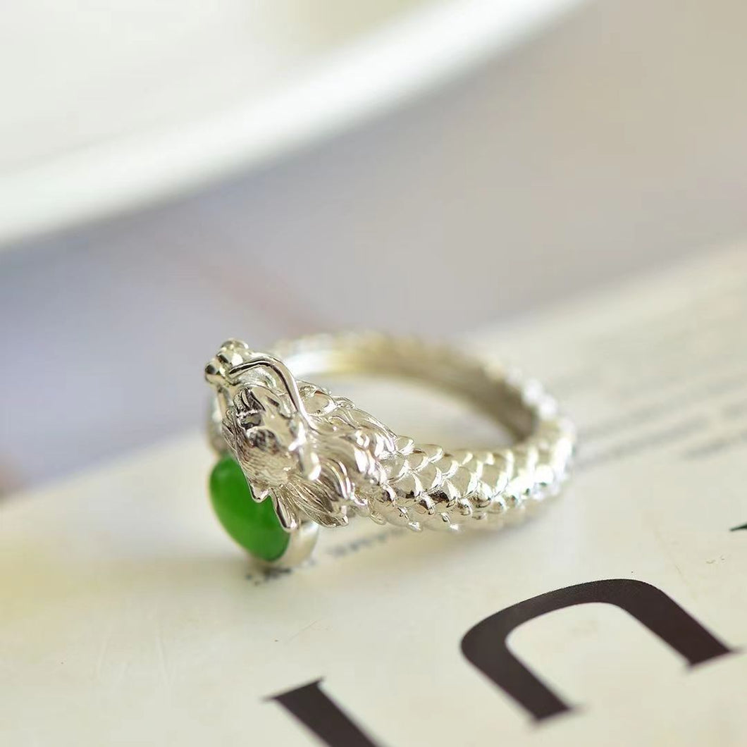 Natural Jade Ring Nephrite Silver Dragon Adjustable Ring TURG340